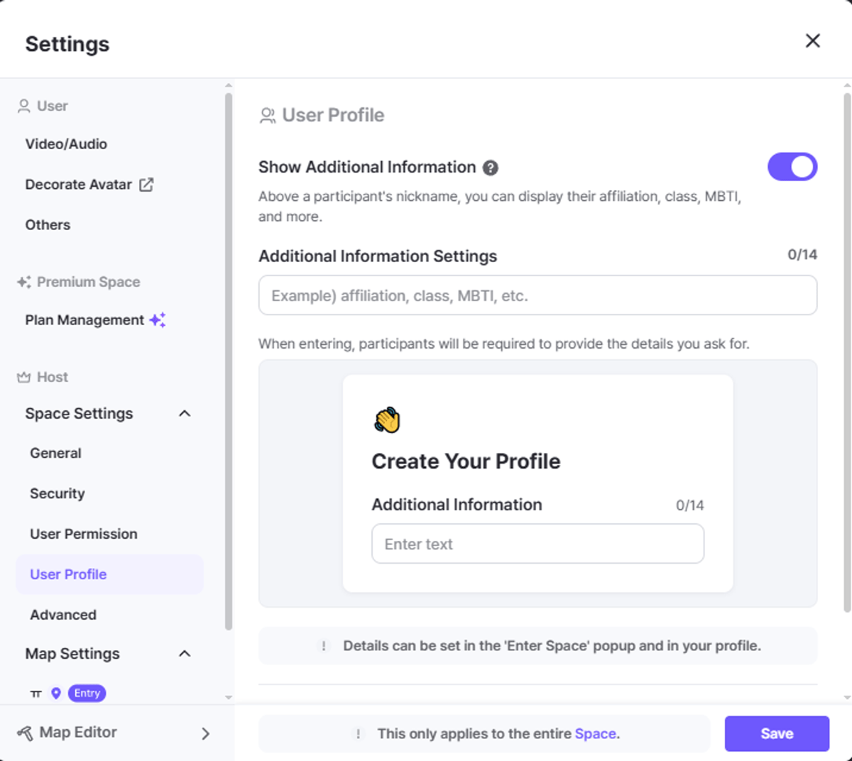 When you turn on this feature, you can add detailed information such as affiliation, student ID number, and MBTI over the participant's nickname.