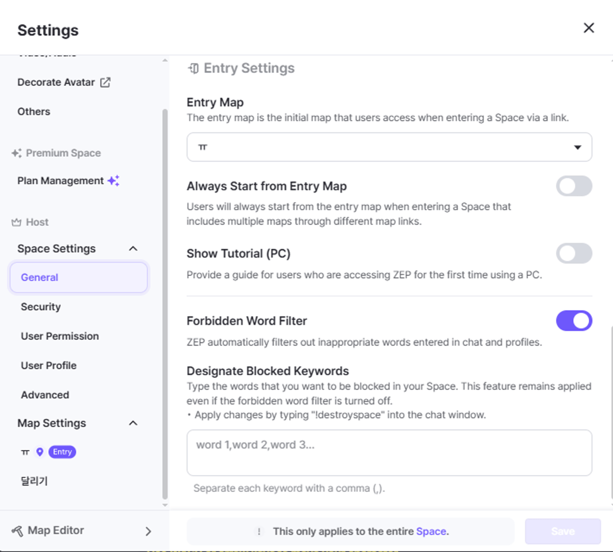 The special restricted words feature additionally restricts users from directly entering certain words.