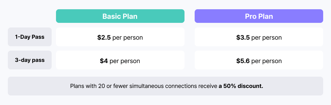 It is free for up to 10 users, and you can select the number of concurrent users in increments of 10. Please refer to the image below for the pricing according to the number of concurrent users.