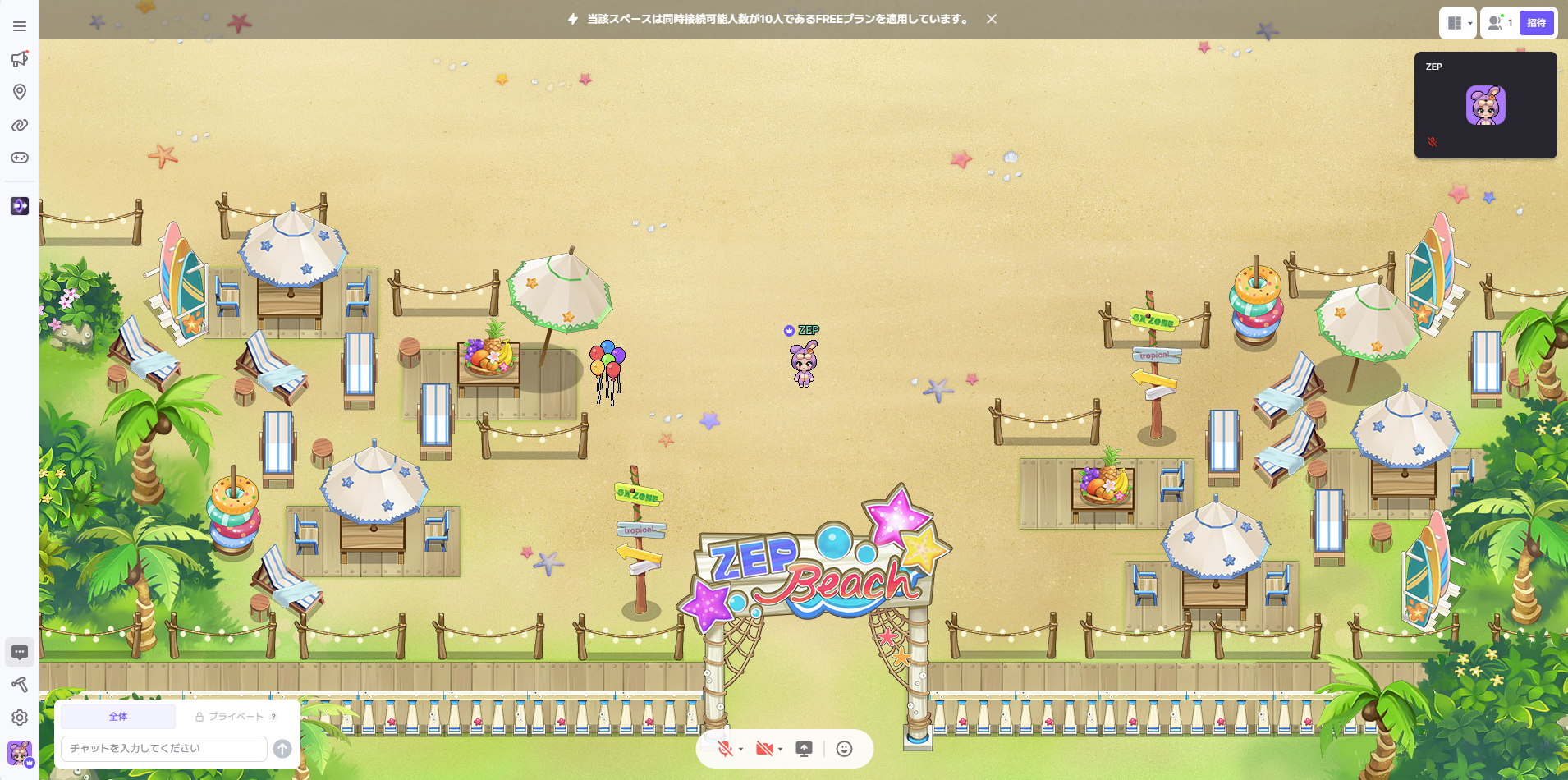 無料でスペースをご利用いただいている場合、プレイ画面の中央上段にFreeプランが適用されていることを案内するバナーが表示されます。