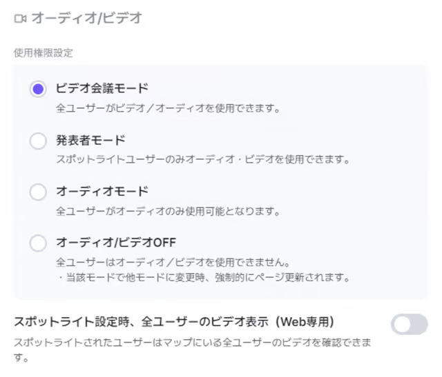 ただし、「オーディオ/ビデオOFF」モードから他モードに変更する場合、ユーザー全員が強制的にページ更新されます。