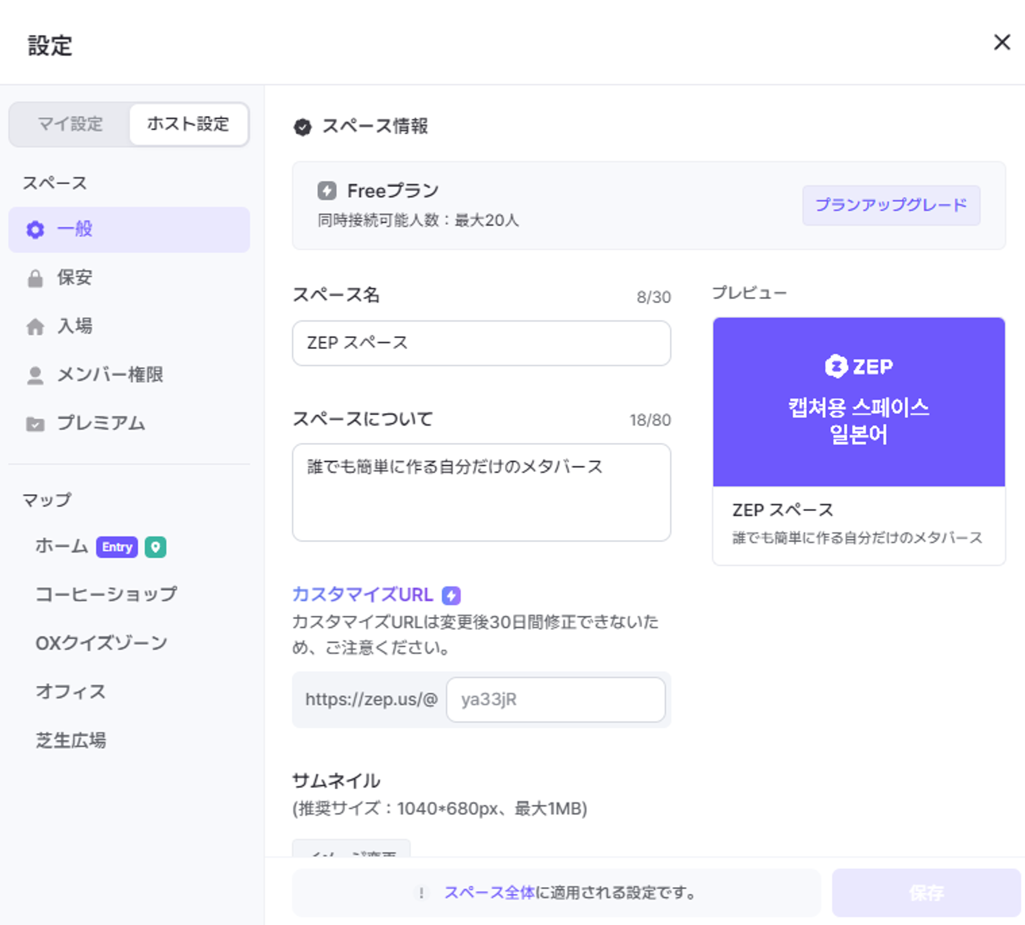 サムネイル、スペース名、スペース紹介を作成して事前に確認することができます。
