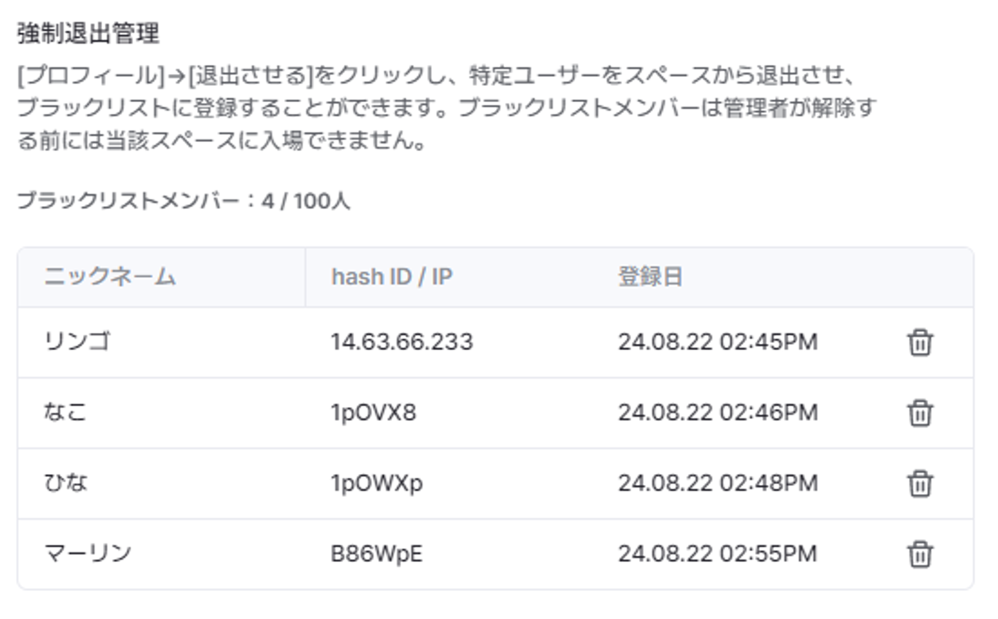 ブラックリストに登録されたユーザーは、管理者が解除するまでスペースにアクセスできません。