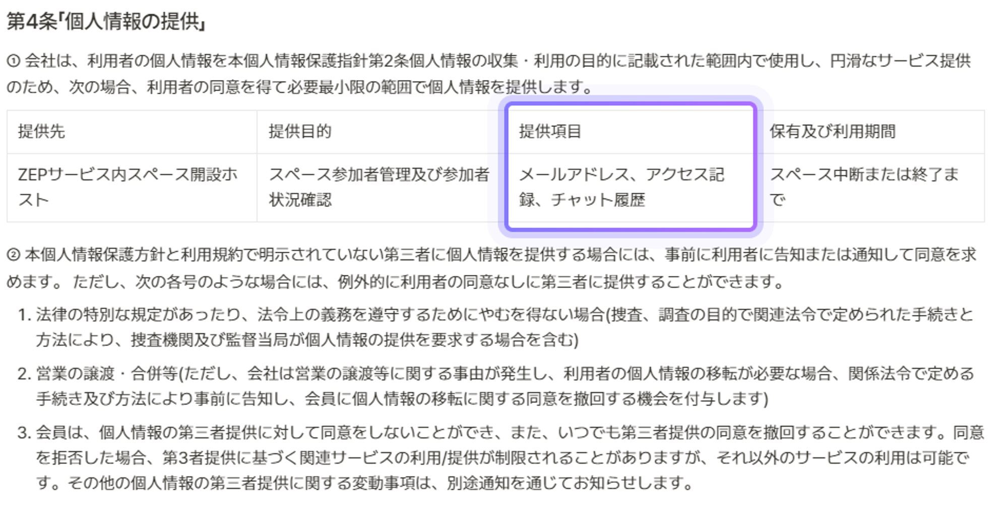 ZEPをご利用の皆様、個人情報処理方針の第4条の変更事項が24年5月23日から適用されることをお知らせいたします。[従来][改定後の内容]今後とも何卒よろしくお願い申し上げます。 ありがとうございます。