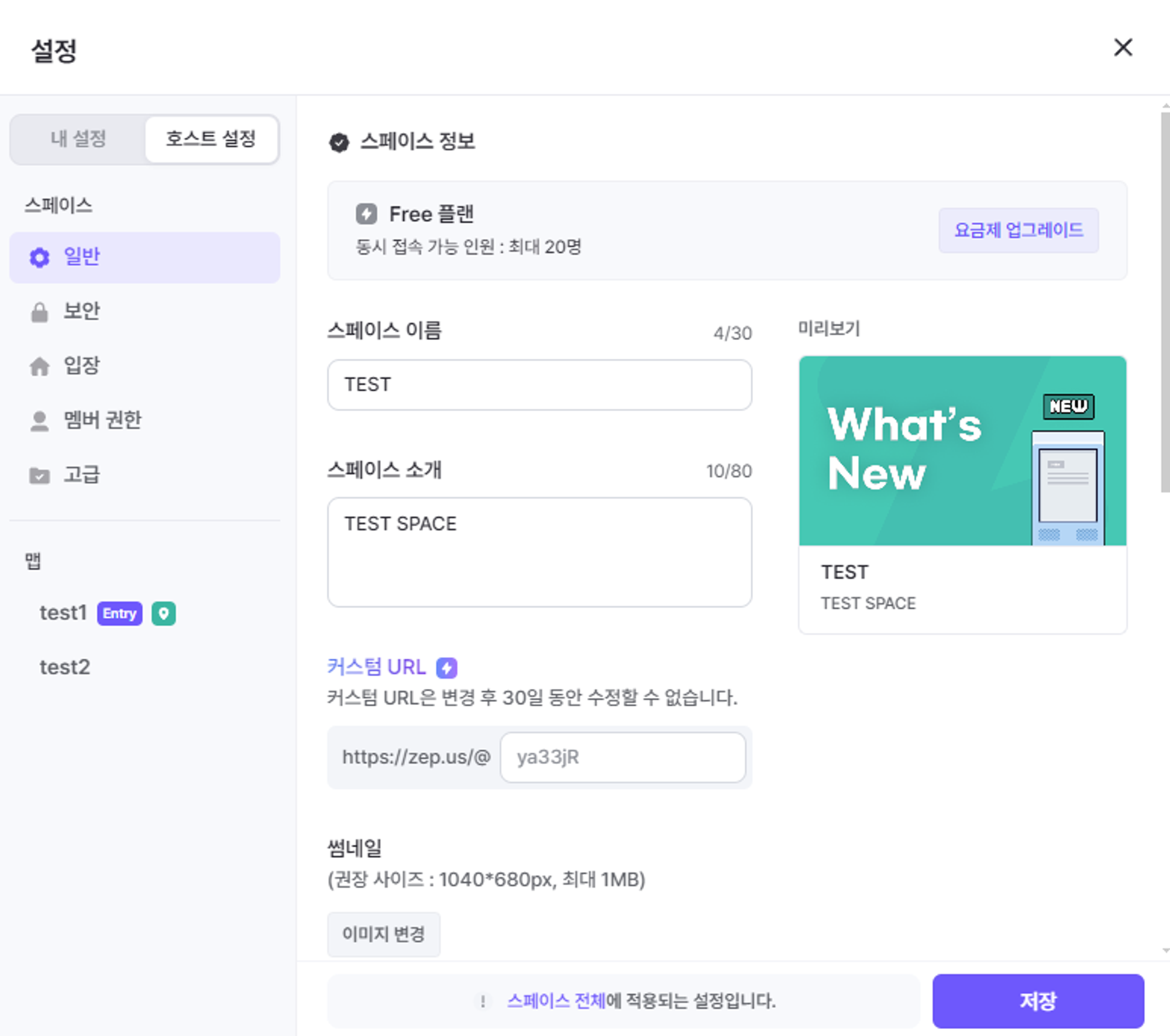 스페이스 썸네일, 이름, 스페이스 소개를 작성하고 미리 확인할 수 있습니다.
