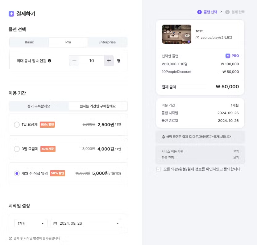 주의사항: 일시납 요금제(1일, 3일, N달)는 다운그레이드(인원수 감소, 또는 Pro 플랜을 Basic으로 변경)가 불가능합니다.