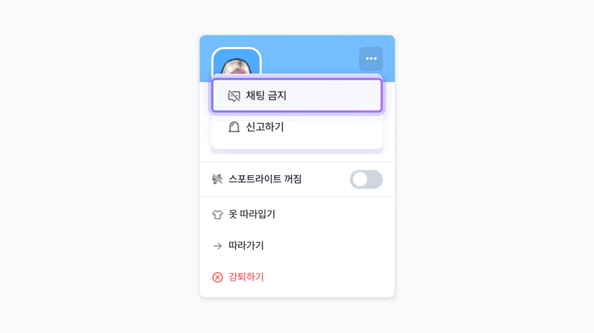 유저의 프로필 혹은 채팅 더보기에서 채팅 금지 버튼을 누르면 해당 유저의 채팅이 제한됩니다.