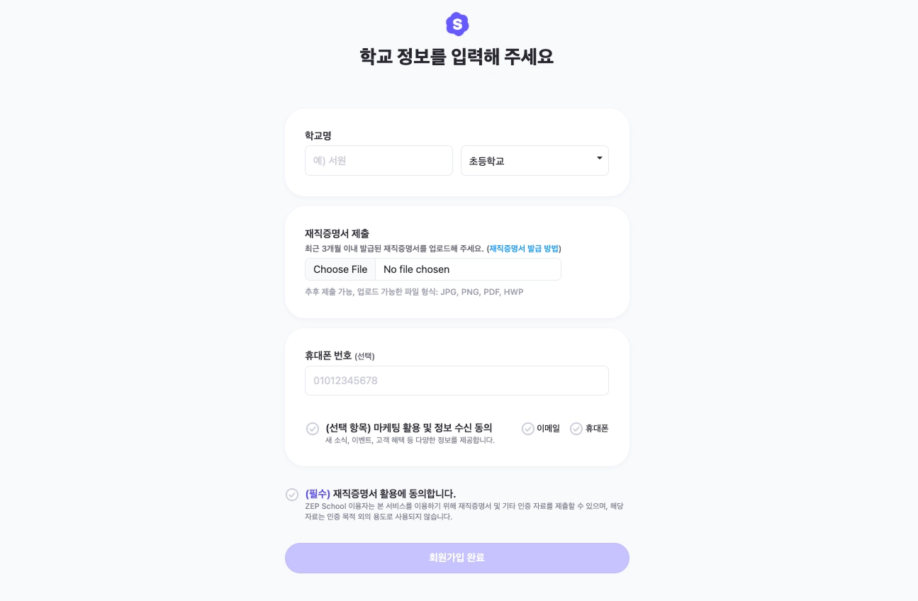 스쿨: 학교 정보(필수), 재직증명서(필수), 전화번호(선택)