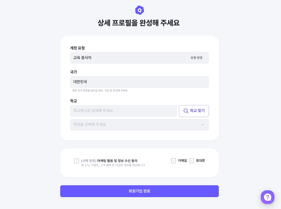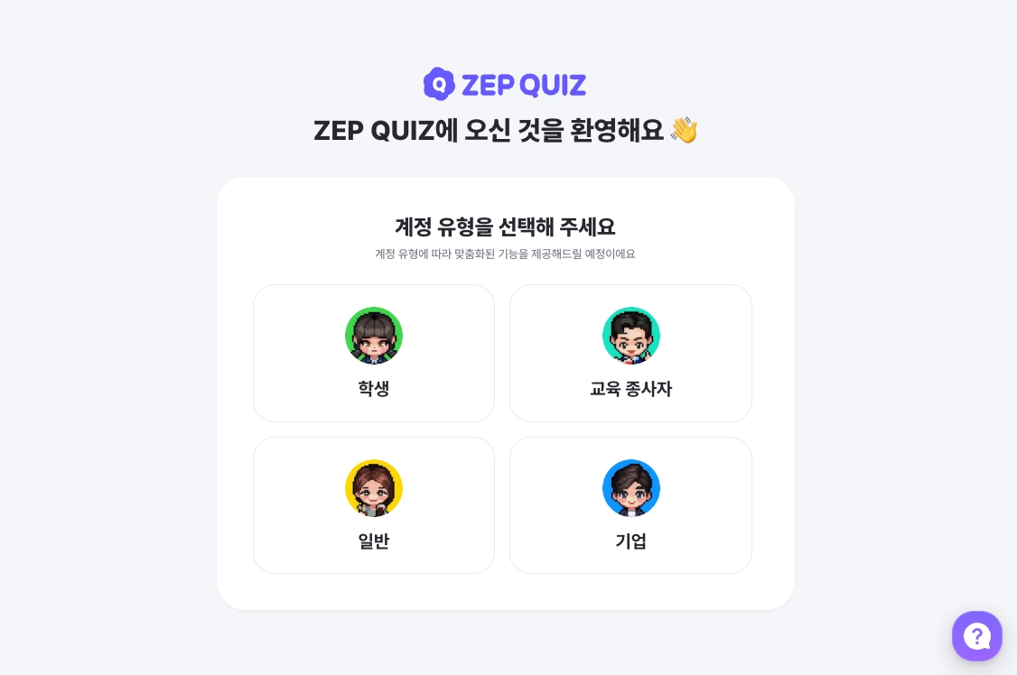퀴즈 서비스 가입 시 아래 계정 유형 중 하나를 선택해야 합니다.