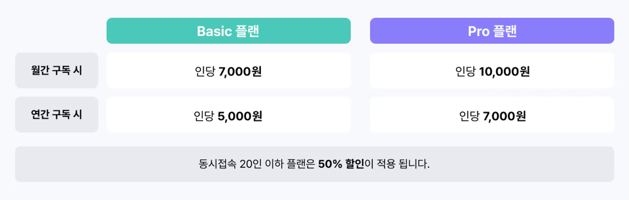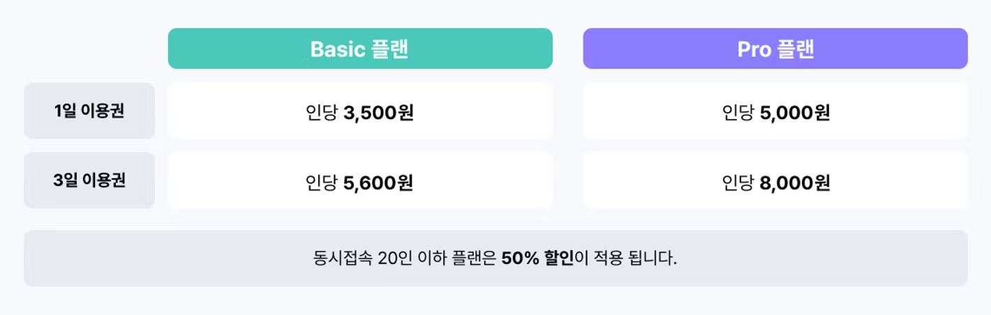동시 접속 인원에 따른 요금은 아래 이미지를 참고해주세요.