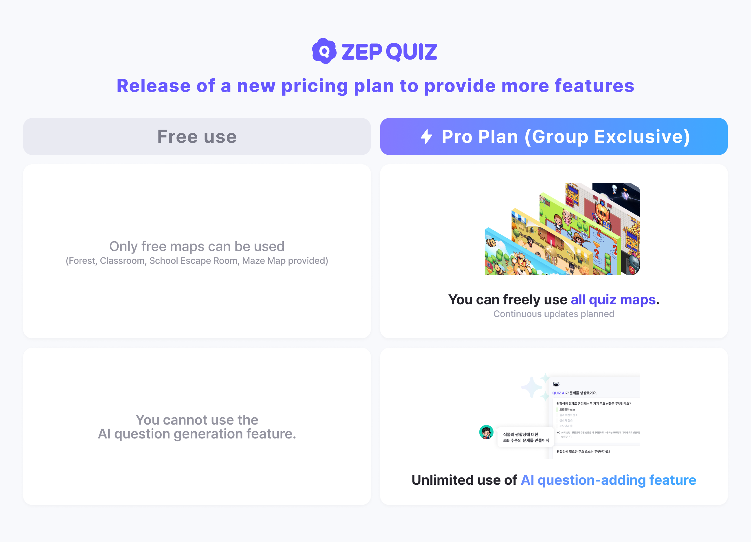 Before the launch of the Pro Plan, quizzes created with the AI feature will be retained as is, and modifications and access will be possible.