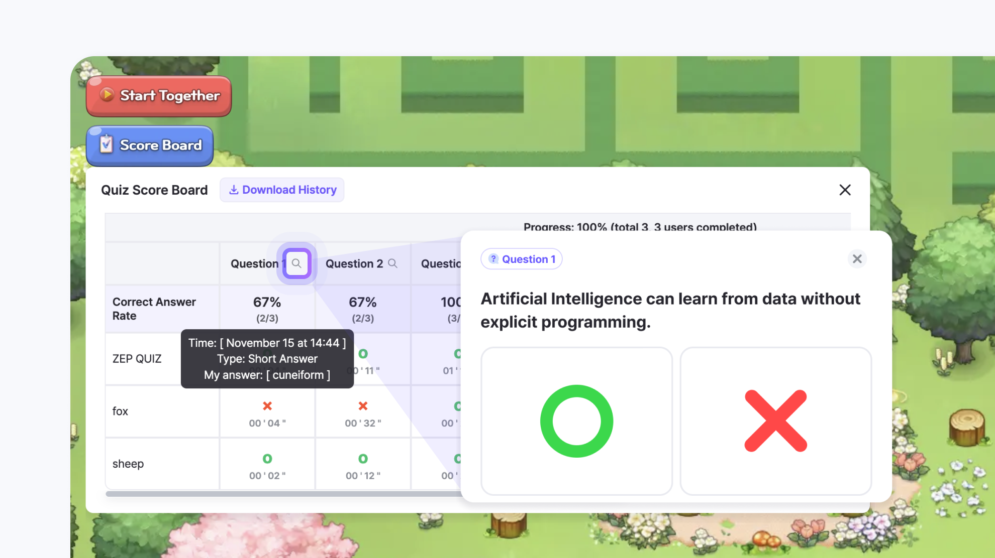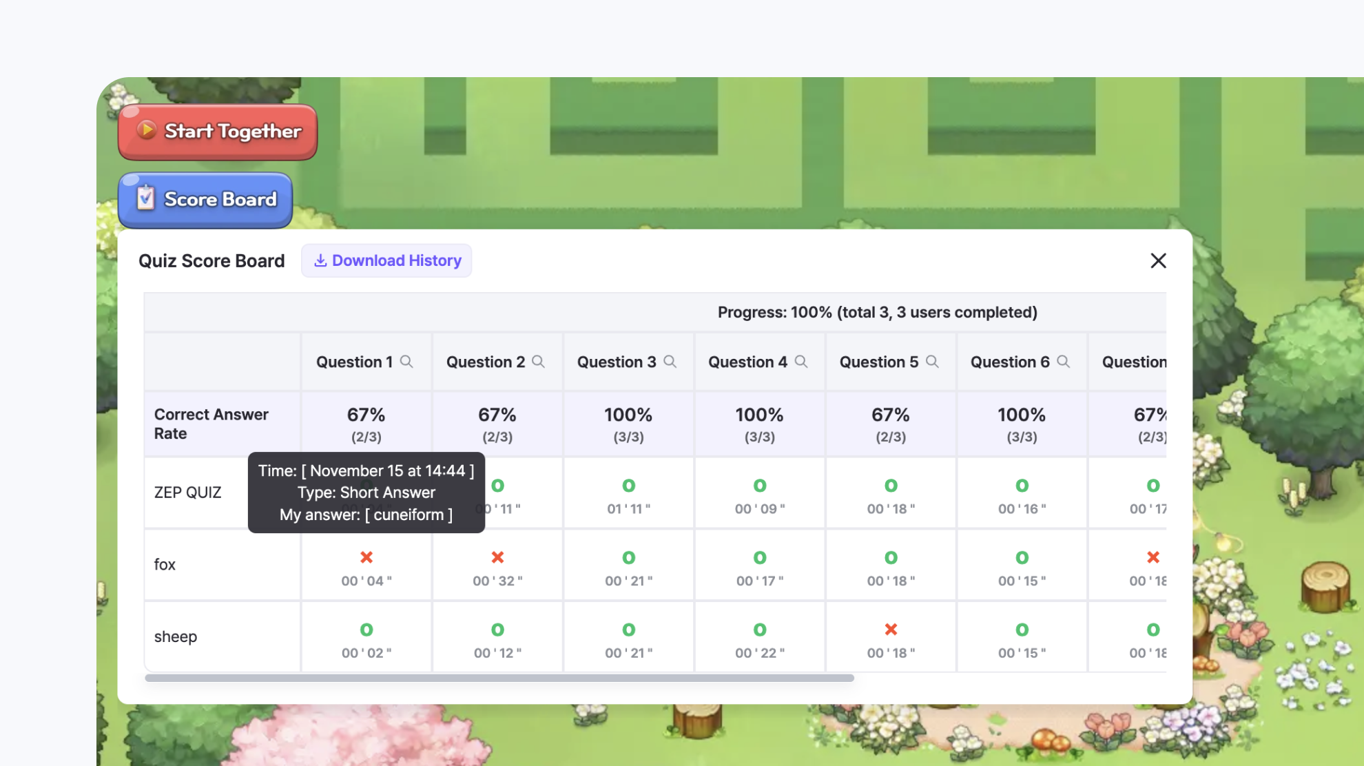 Press the Download History button to download an Excel file with the quiz results Learning date and time, correctness of answer, submitted answer, solving time, total score, completion record can be checked.