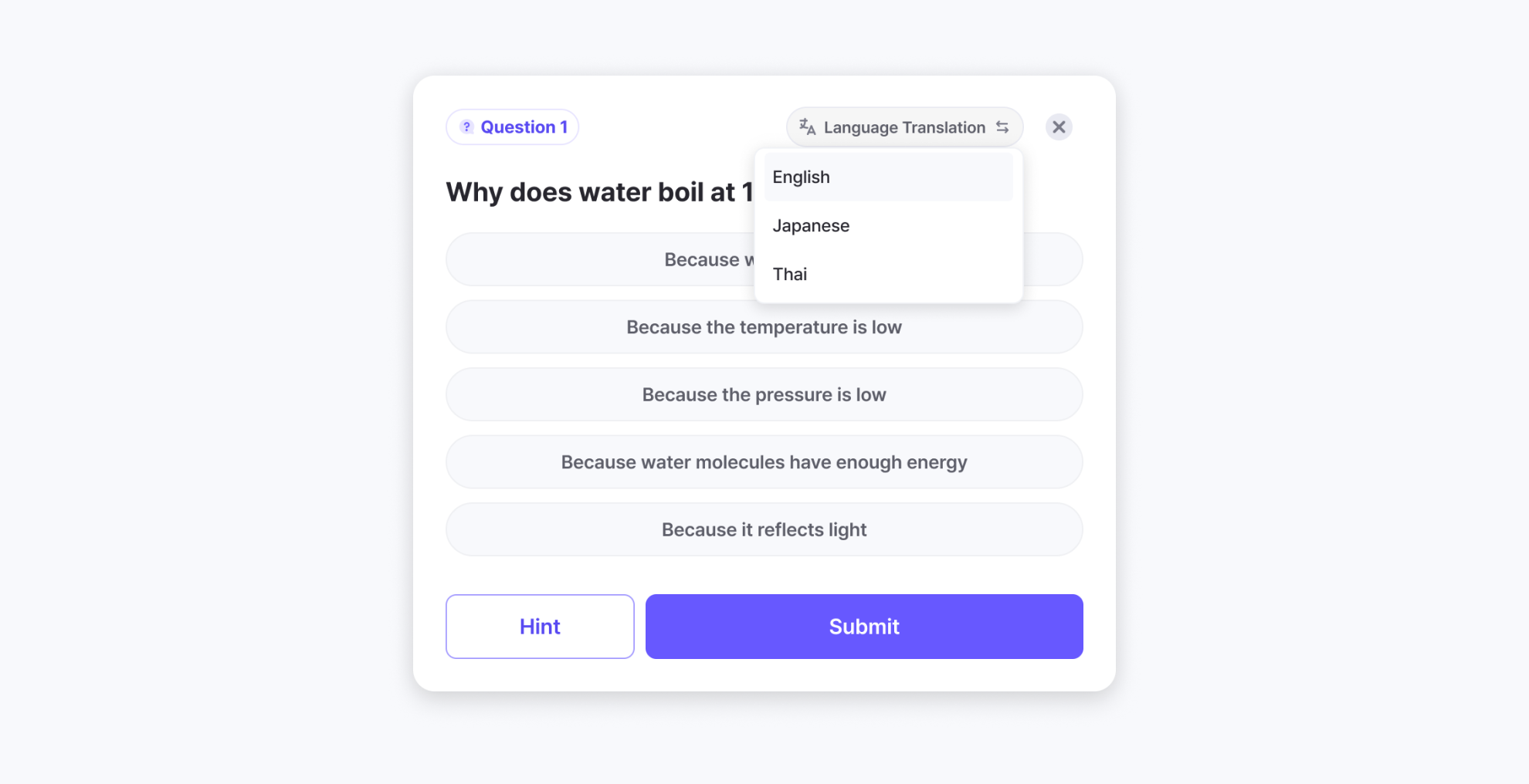 The quiz content will be automatically translated by AI into the selected language in real-time.