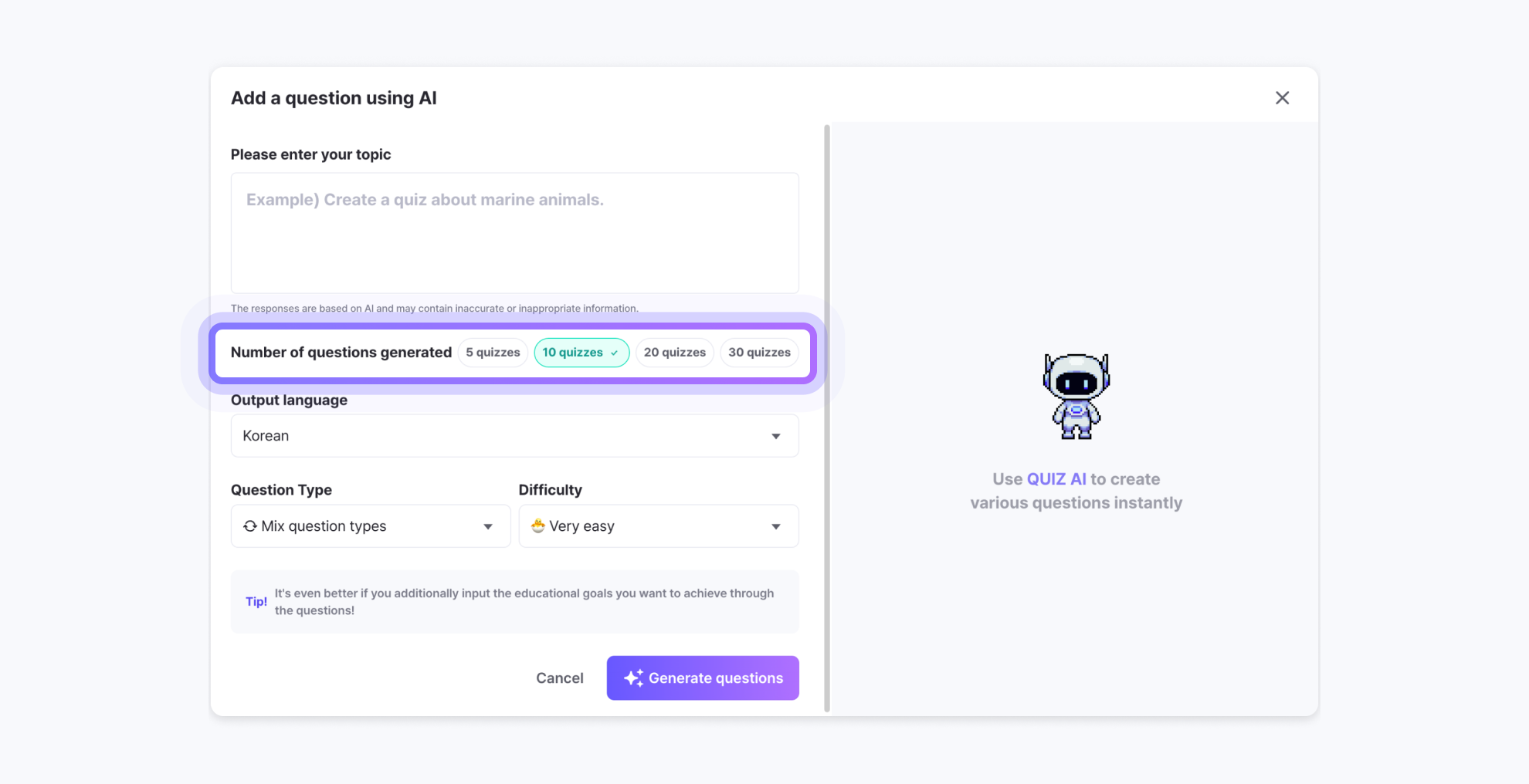 You can now select the number of questions to generate when using AI to create quizzes! Previously, it defaulted to 10 questions.