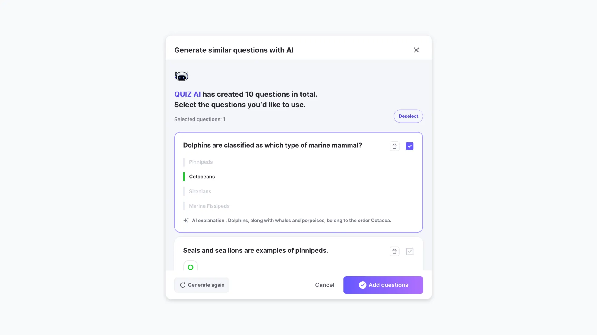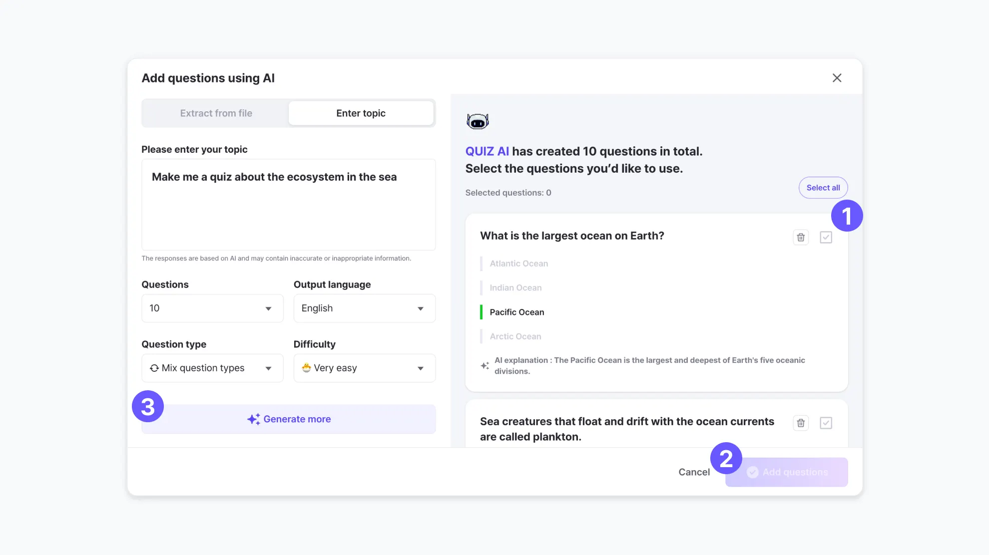 Select as many quizzes as you like from the 10 questions generated by the AI.