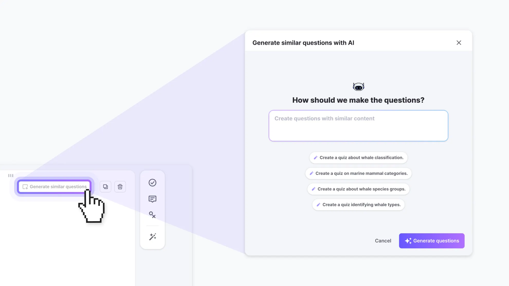 Generate Similar Questionsbutton on the top right of the question card.You can type the direction in which you want the new question to be generated, or choose from the suggested prompts provided by AI.