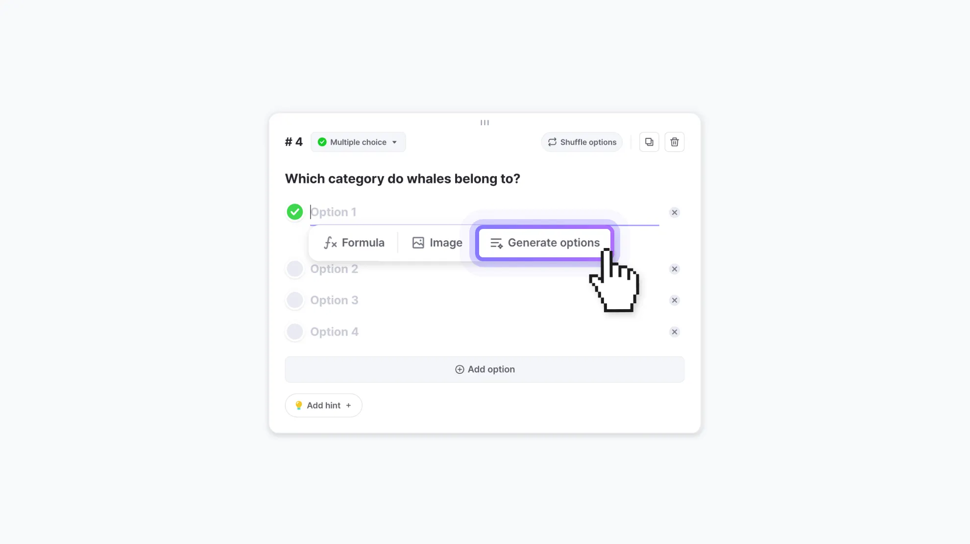 Generate optionsbutton.For Multiple-Choice: The AI automatically generates options that fit the context and the correct answer.