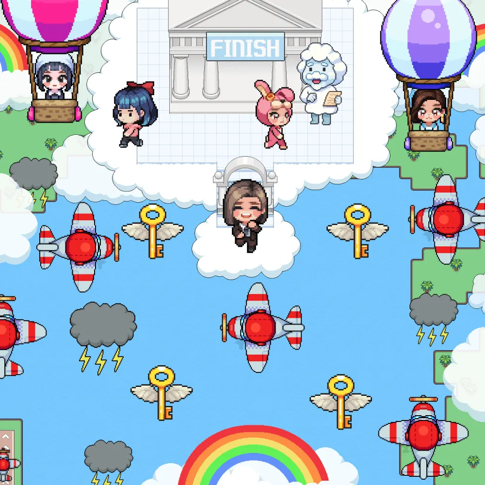 Embark on a thrilling sky journey, avoiding lightning and collecting keys to reach the temple.