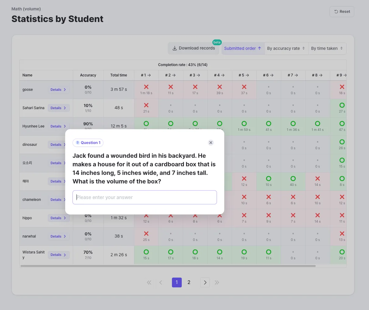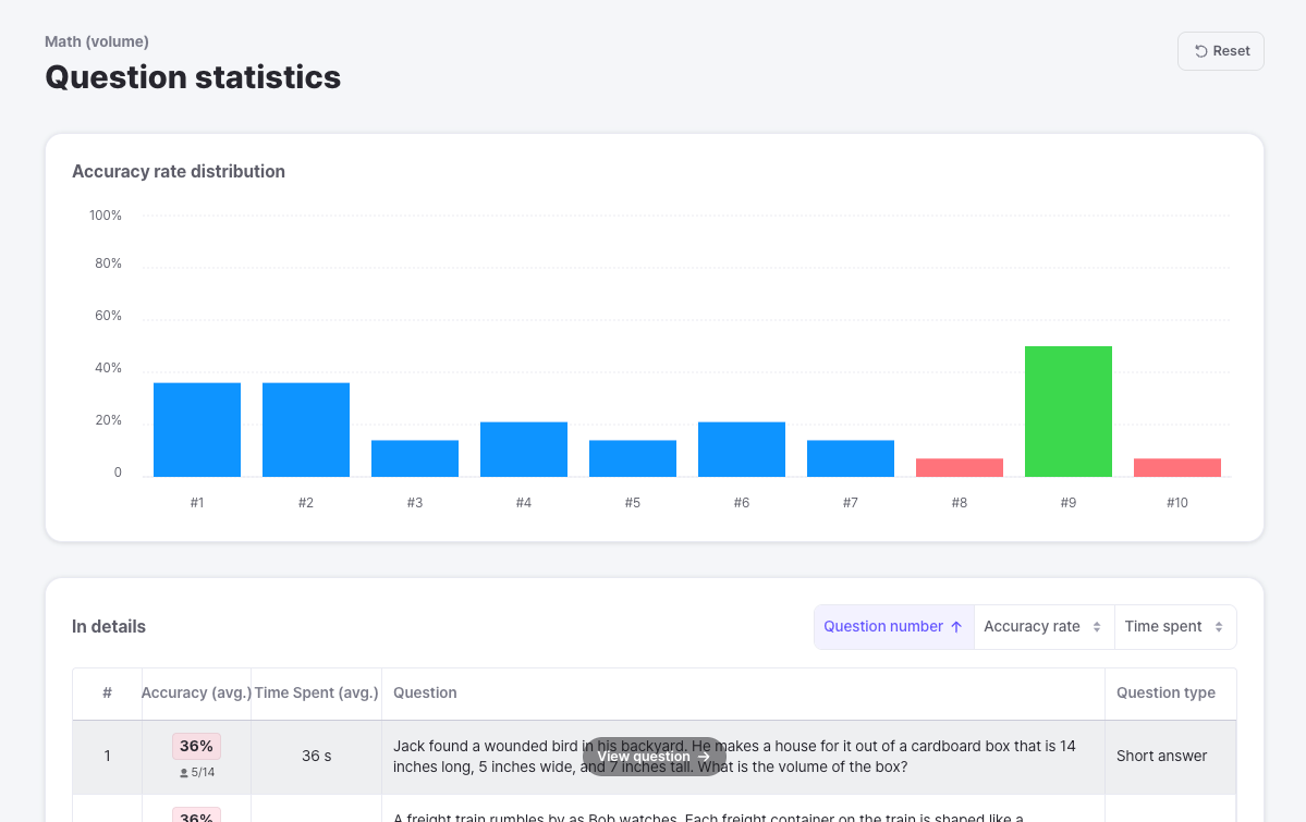 You can now view individual questions in the Learning Report! Hover over a question in the question statistics section to see a “View Question” button for easy access. Additionally, by clicking the arrow icon next to the question number in the student statistics view, a modal for the same question appears, making quiz analysis much easier!