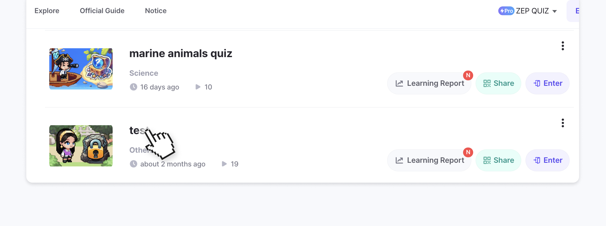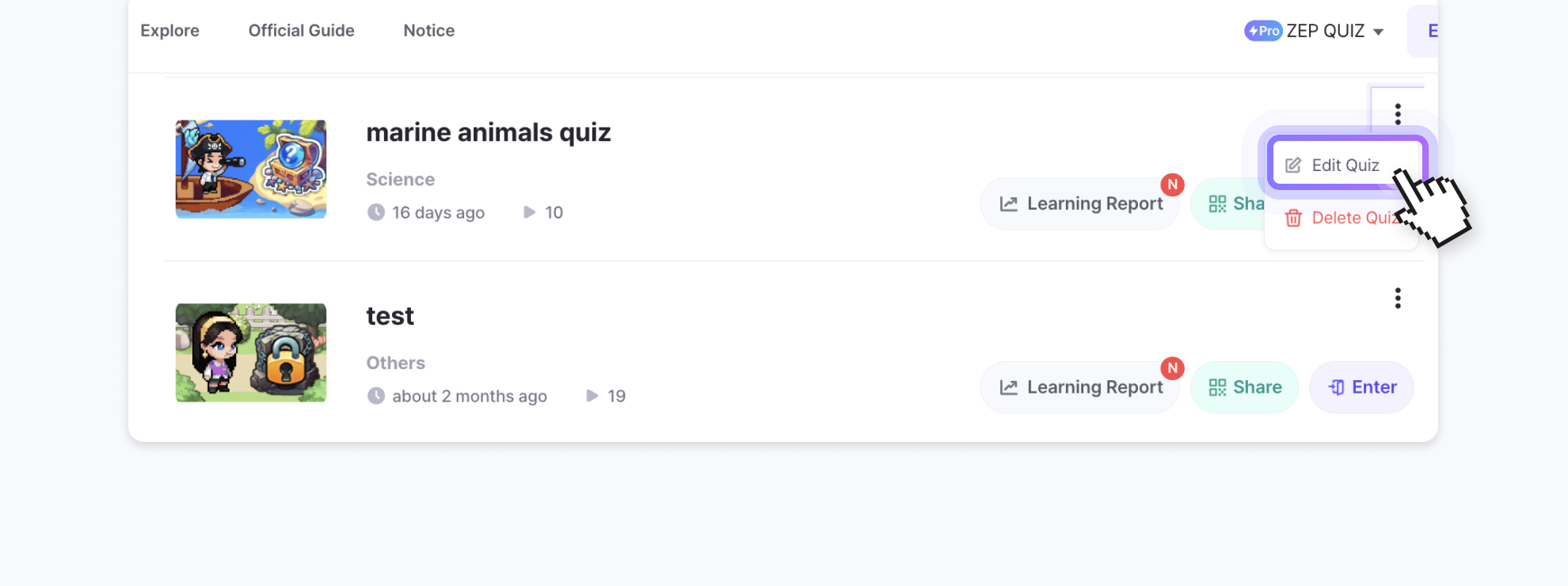 2. Go to “My Quizzes” and click on the name of the quiz you want to edit.