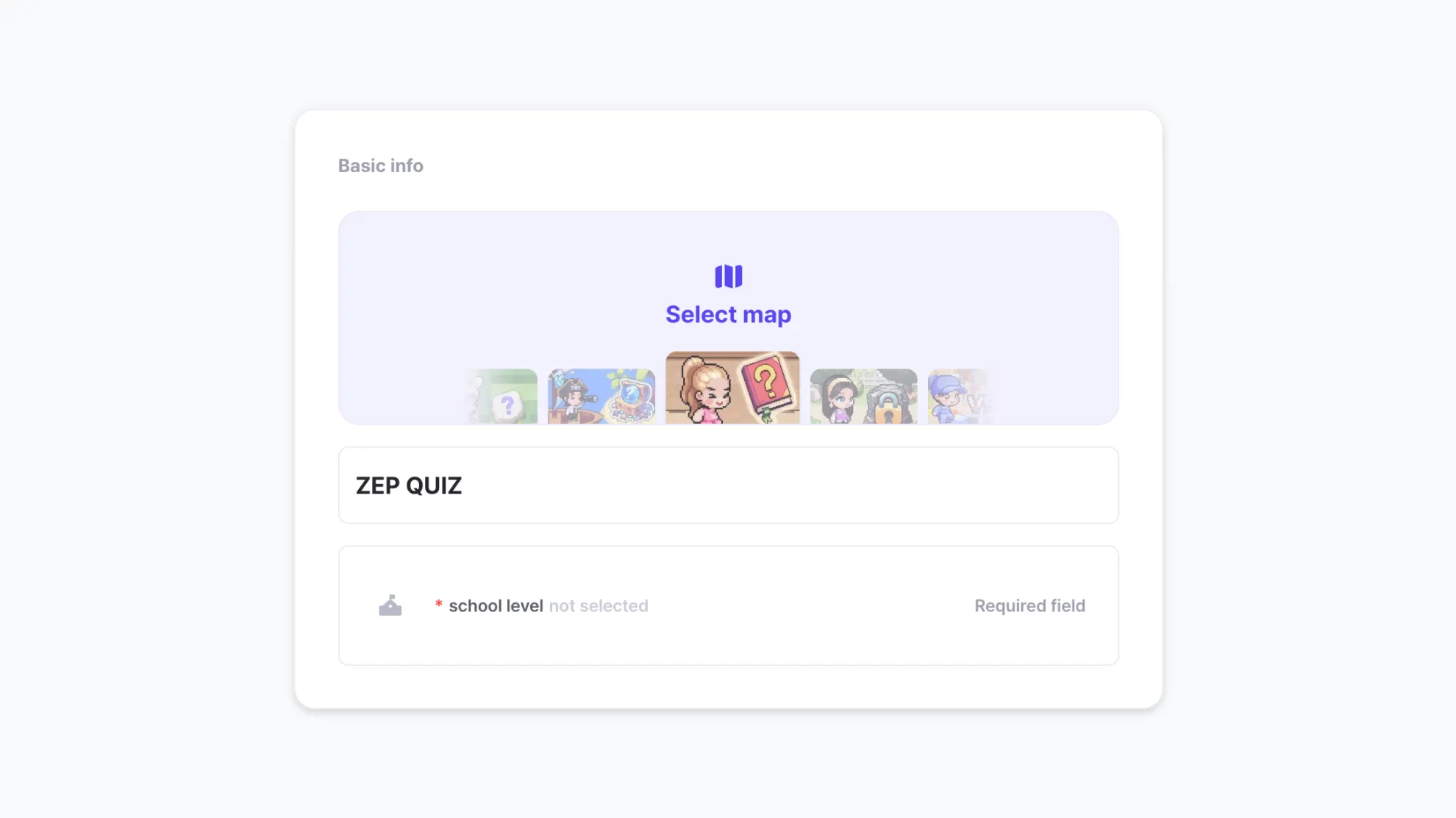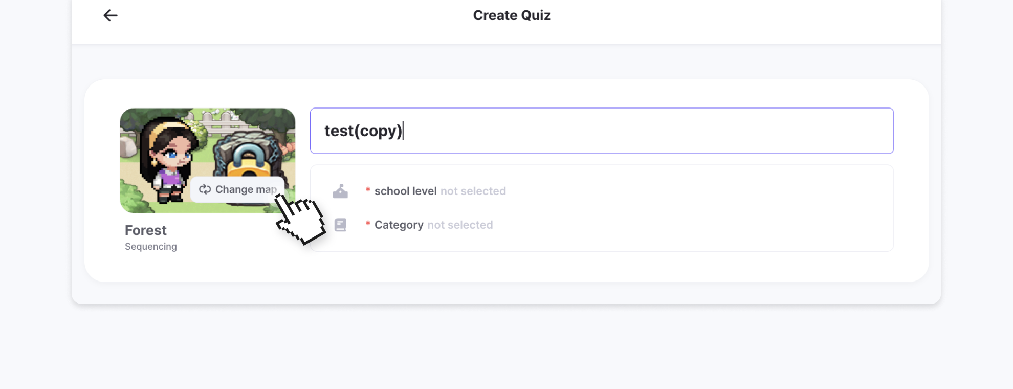 You can set the Map Selection, Quiz Title, and School Level/Category.