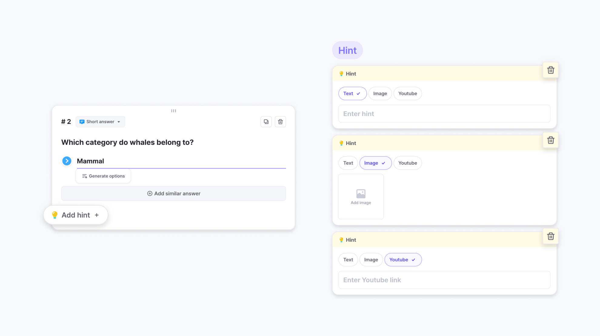 For students who find the questions difficult, you can add hints in the form of text, images, or YouTube videos.