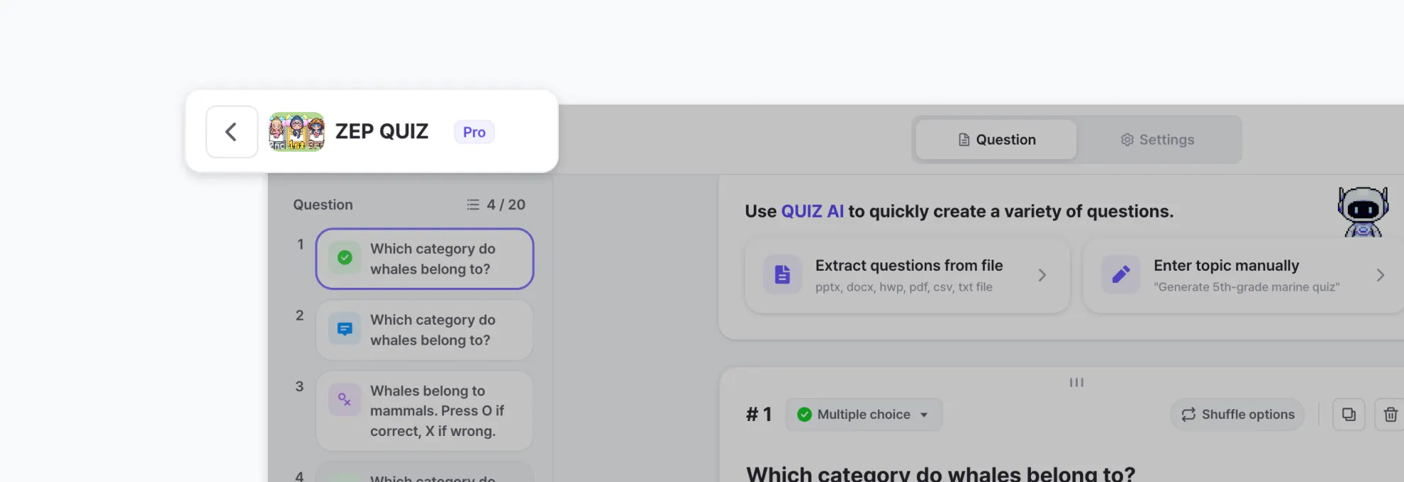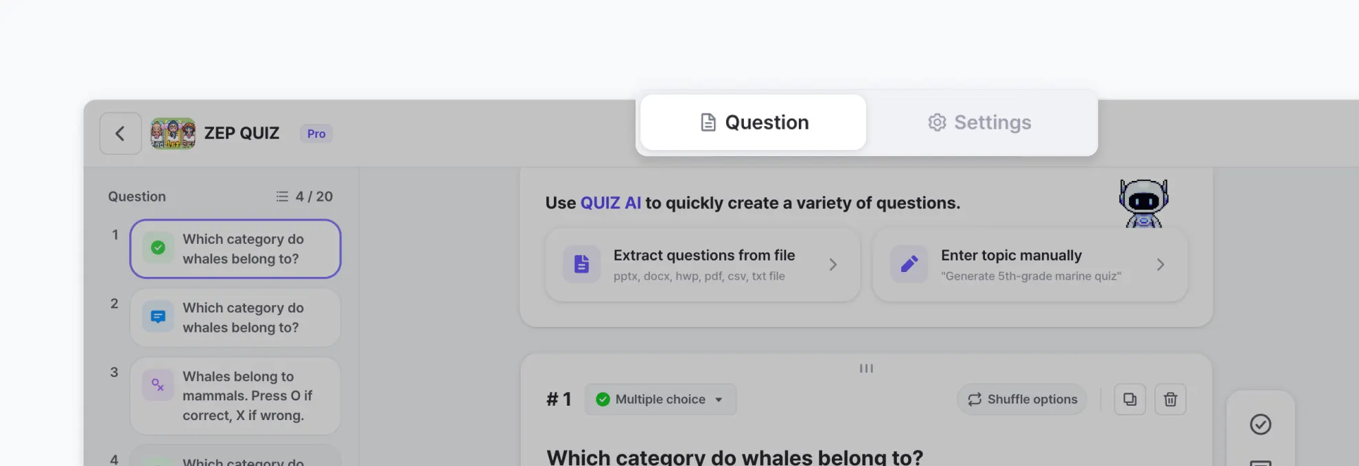 Freely switch between the Questions and Settings tabs in the center of the header.
