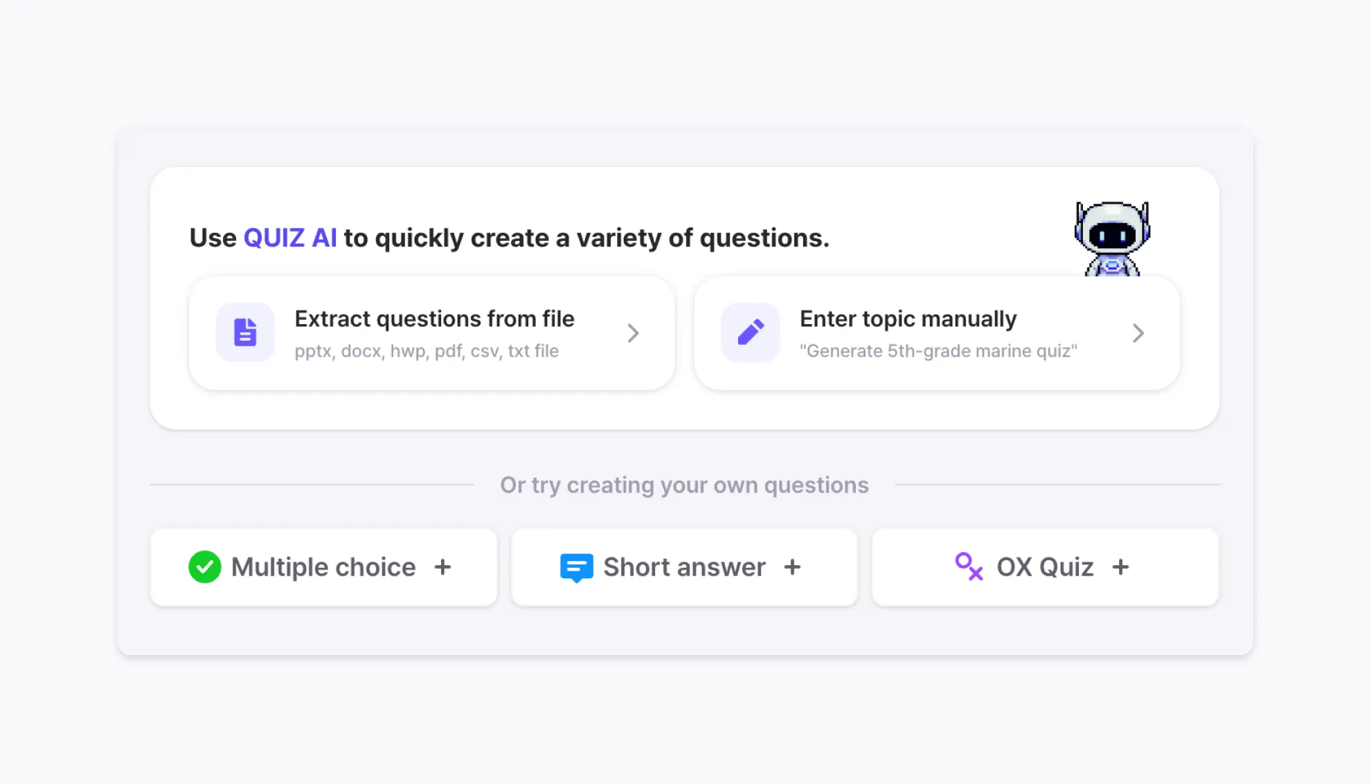 Click the type of question you want to create and add: Multiple-choice question, Short-answer question, OX Quiz