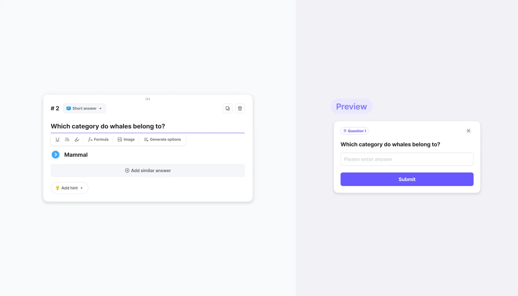 During the question creation or modification process on the screenAdd hint +Clicking the button will create a hint input field.