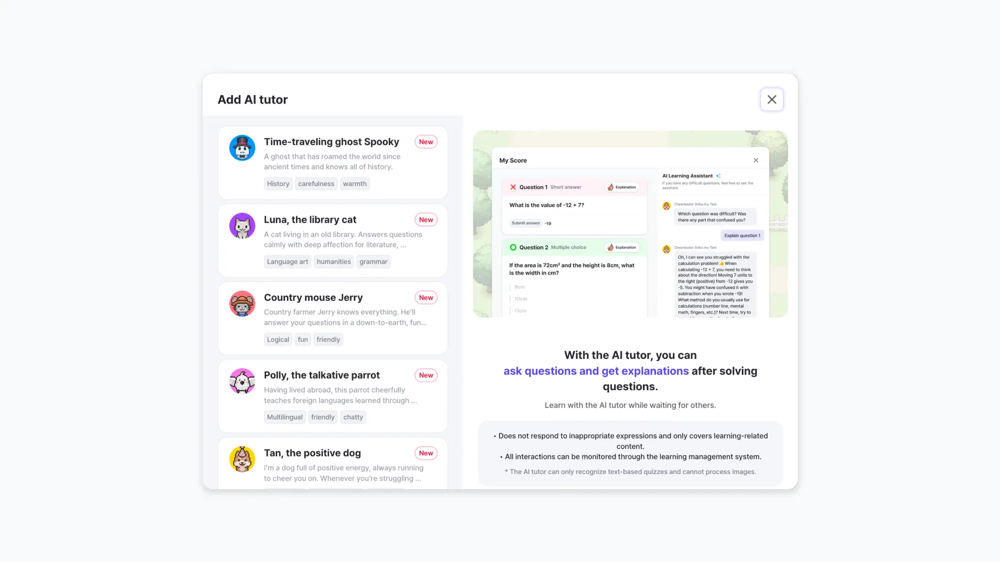 You can input formulas in Multiple-Choice, Short-Answer, and O/X questions, as well as in the Multiple-Choice options! Please refer to the Formula Input Guide for details.