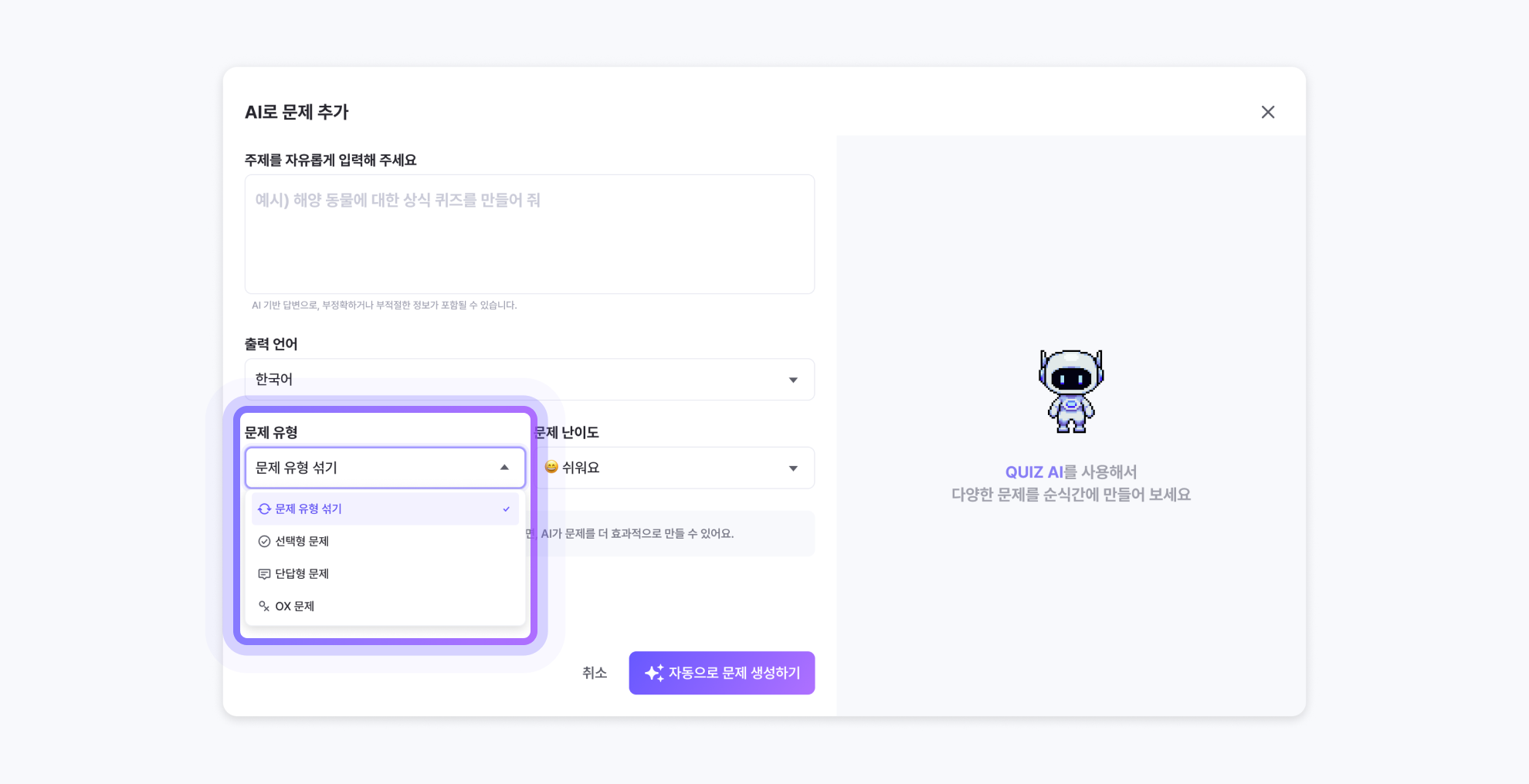 Now, you can use the “Mix Question Types” option to automatically create quizzes with a variety of formats—multiple choice, short answer, and true/false.