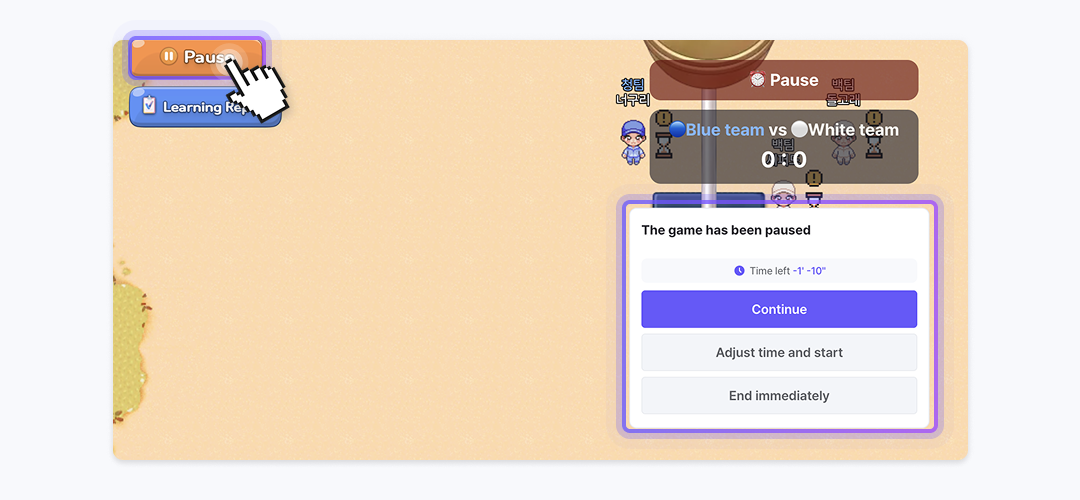 Increase or decrease the time based on the game’s progress, then resume play or end the game immediately.