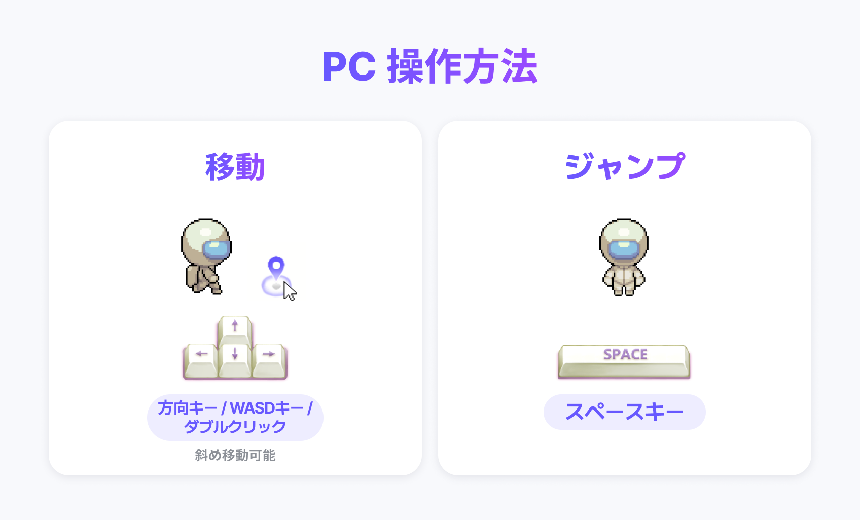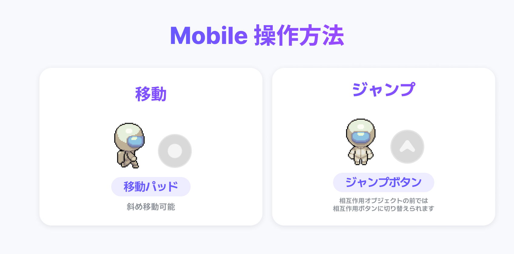 PCは方向キーで、モバイルはパッドとボタンでアバターを操作できます。