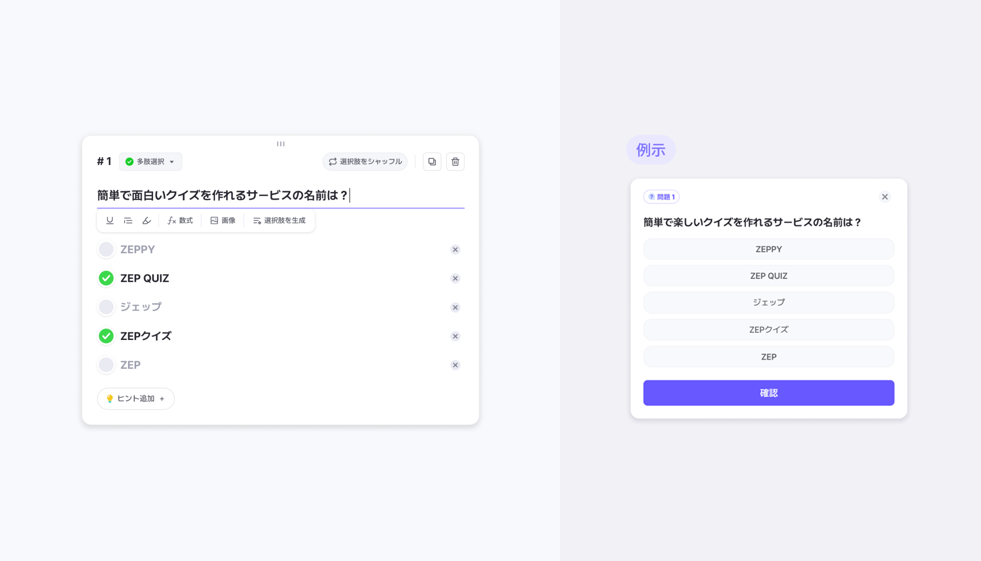+ 許容解答ボタンを押して設定することができます。(例:ゼップクイズ、ZEP QUIZ、ZEP クイズのすべて正解として認められるように設定できます)現在短答式の正解の場合、分かち書きや英文字の大文字・小文字の区別はありません。