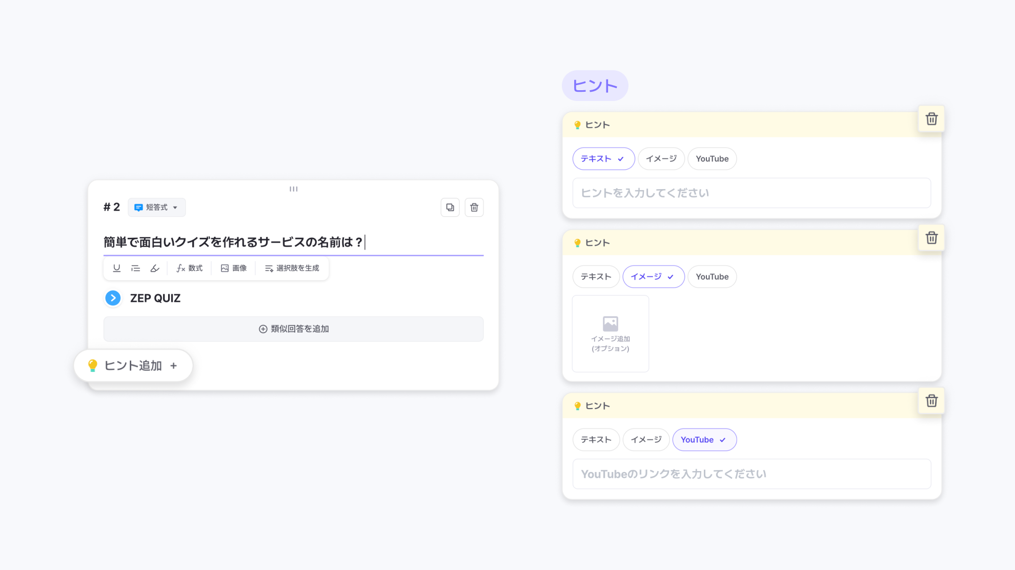 ヒント追加 +ボタンを通じてヒントを提供できます。ヒントはテキスト、イメージ、YouTubeの3種類で提供できます。