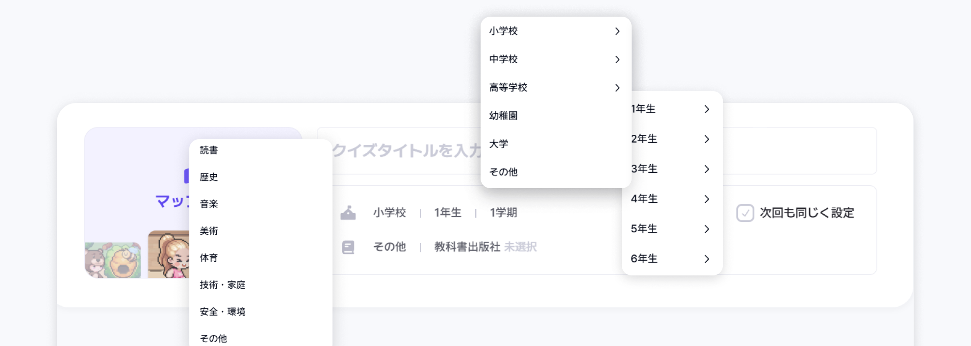 マップ選択、クイズタイトル、学校級/カテゴリーを設定できます。