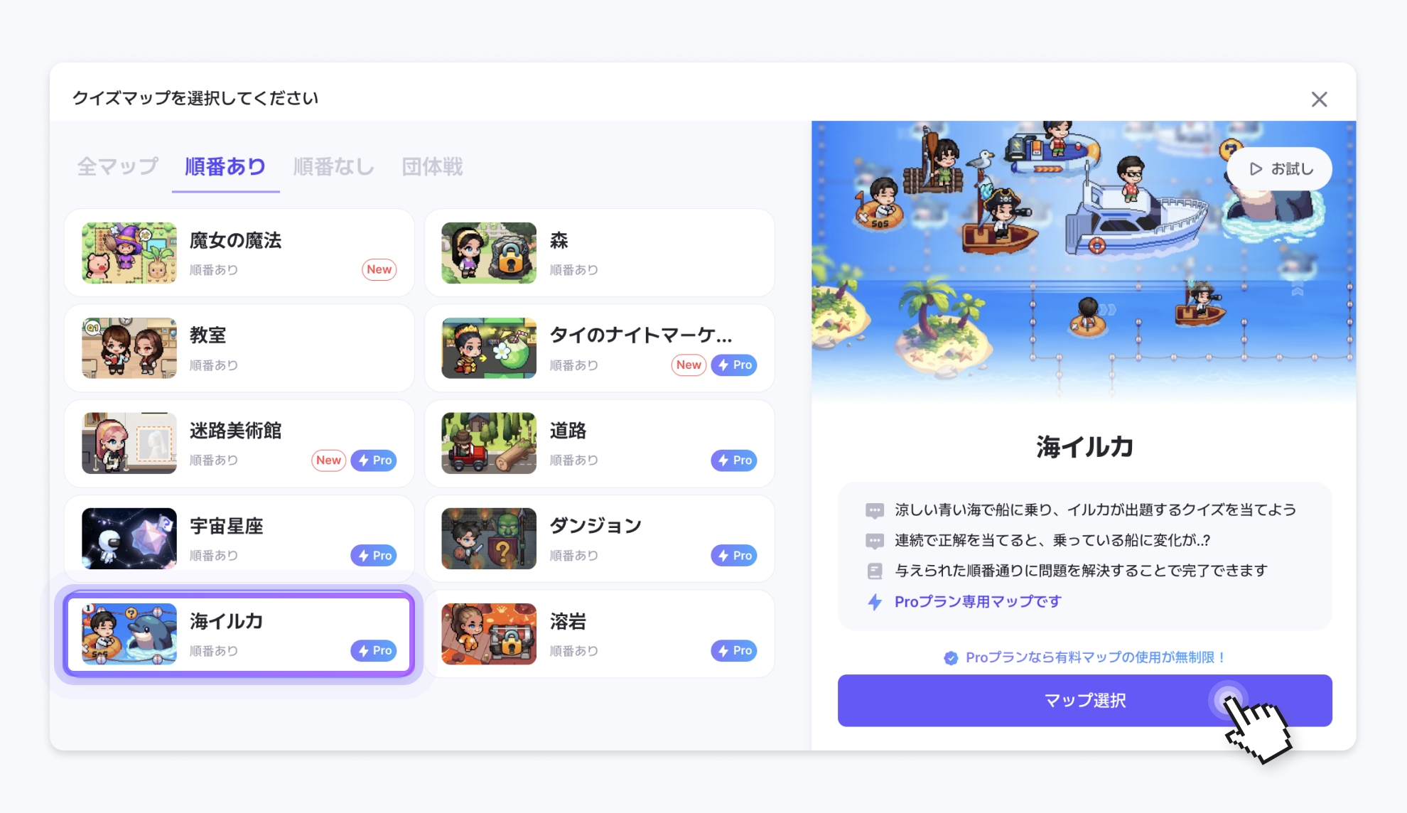 マップはクイズを解く方法により順番ありマップ、順番なしマップ、団体戦マップの3種類に分かれます。