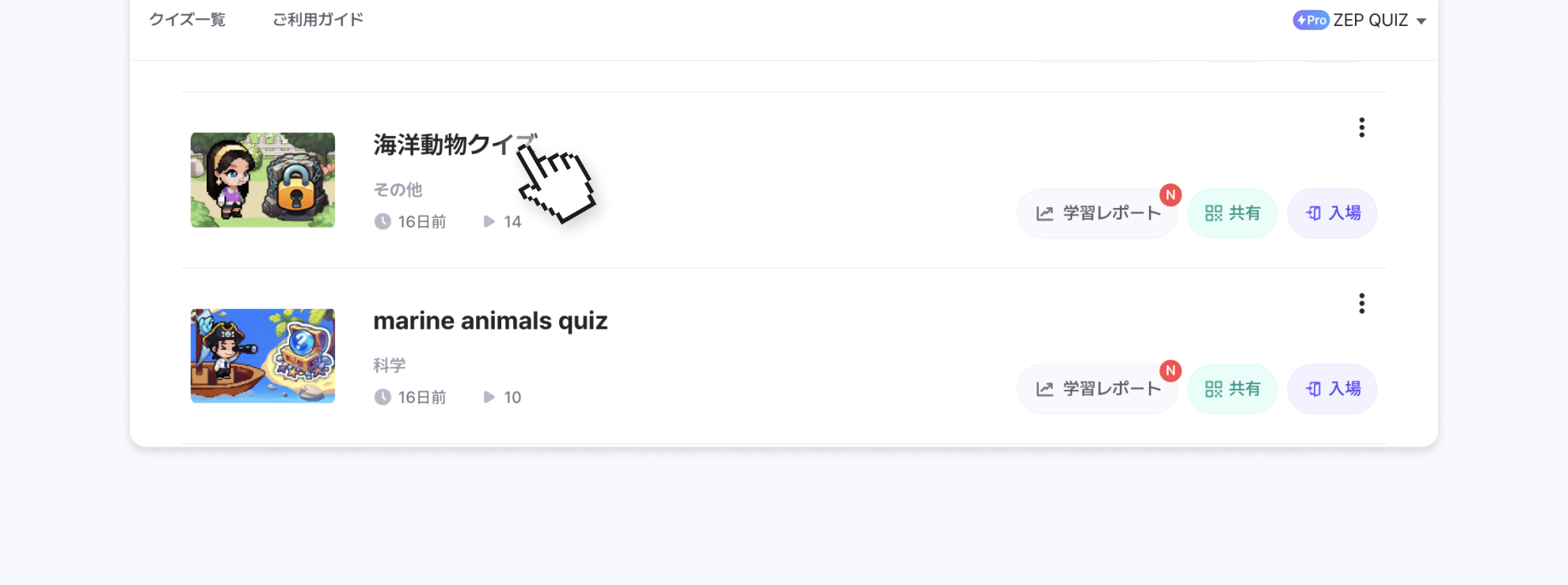 プランが満了された場合、非公開クイズは自動的に公開になり、[クイズ一覧]ページに表示されます。