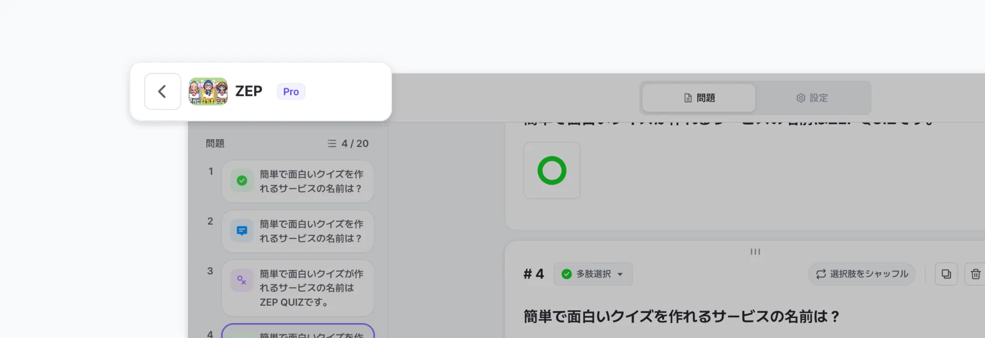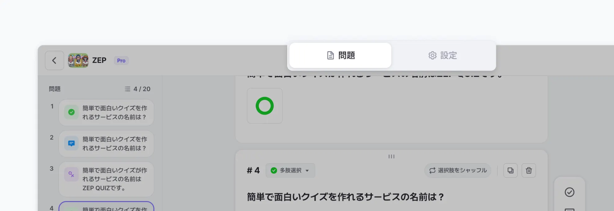 ヘッダー中央にある問題タブと設定タブを自由に切り替えることができます。
