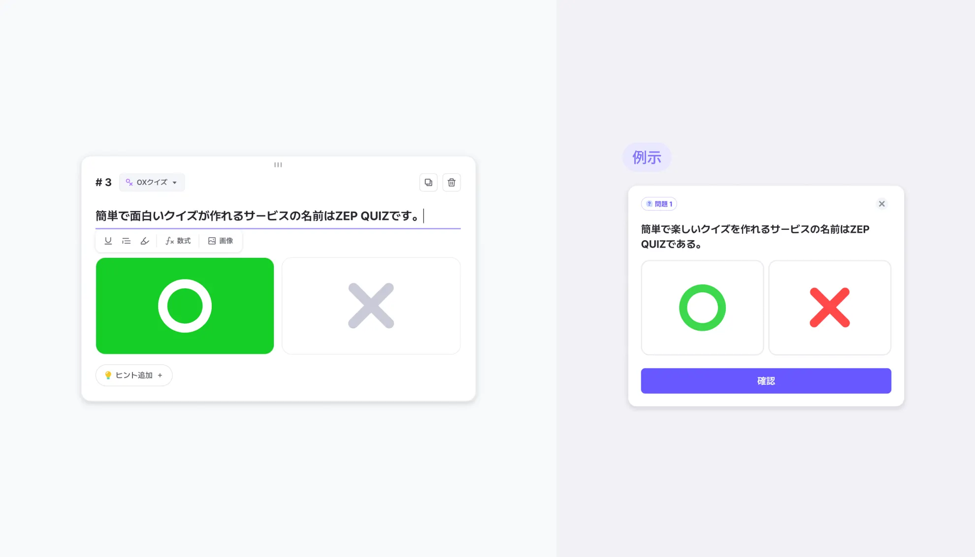 イメージ追加(オプション)ボタンを通じてイメージを追加できます。(jpg、jpeg、png、webp、gif形式/最大3MB制限)OXいずれかを選択し、正解として設定してください。ヒント追加 +ボタンを通じてヒントを提供できます。ヒントはテキスト、イメージ、YouTubeの3種類で提供できます。
