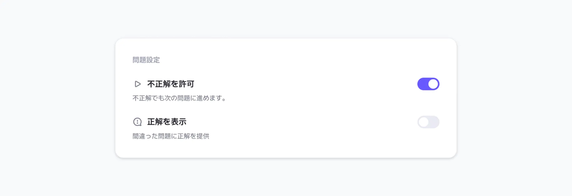 間違えたら正解を表示: 誤答提出時、実際の正解を5秒間表示します。次の問題に進む前に、問題の正解を確認してから進むことができます。
