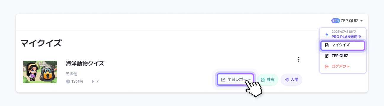 マイクイズページで確認したいクイズの[学習レポート]ボタンをクリックしてください。