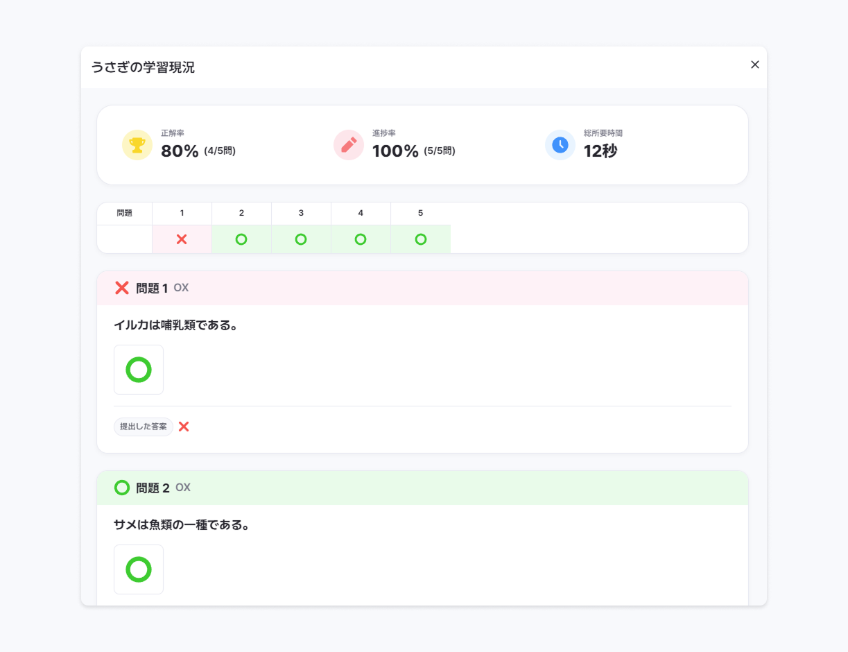 各学生の正解率、進捗率、総所要時間を確認できます。