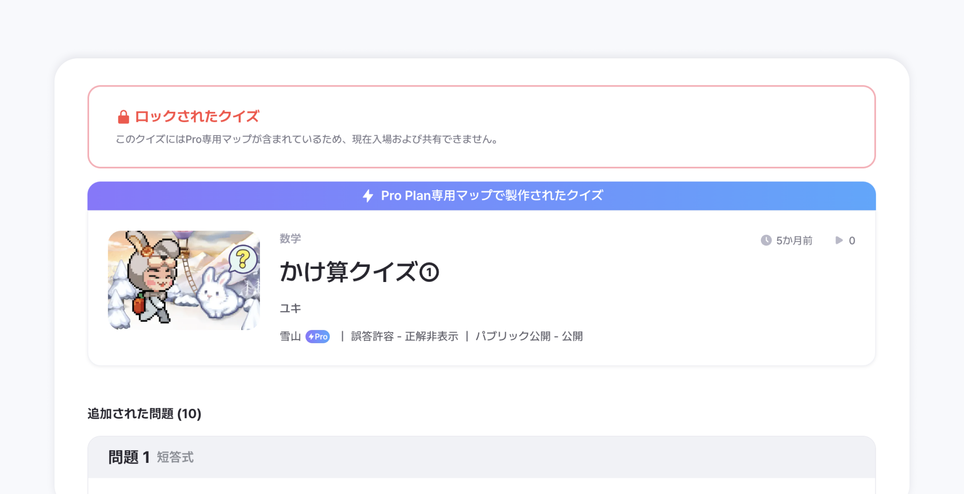 「Proプラン専用マップ」で作成されたクイズは、作成者のProプランが期限切れになると、次の機能が制限されます。
