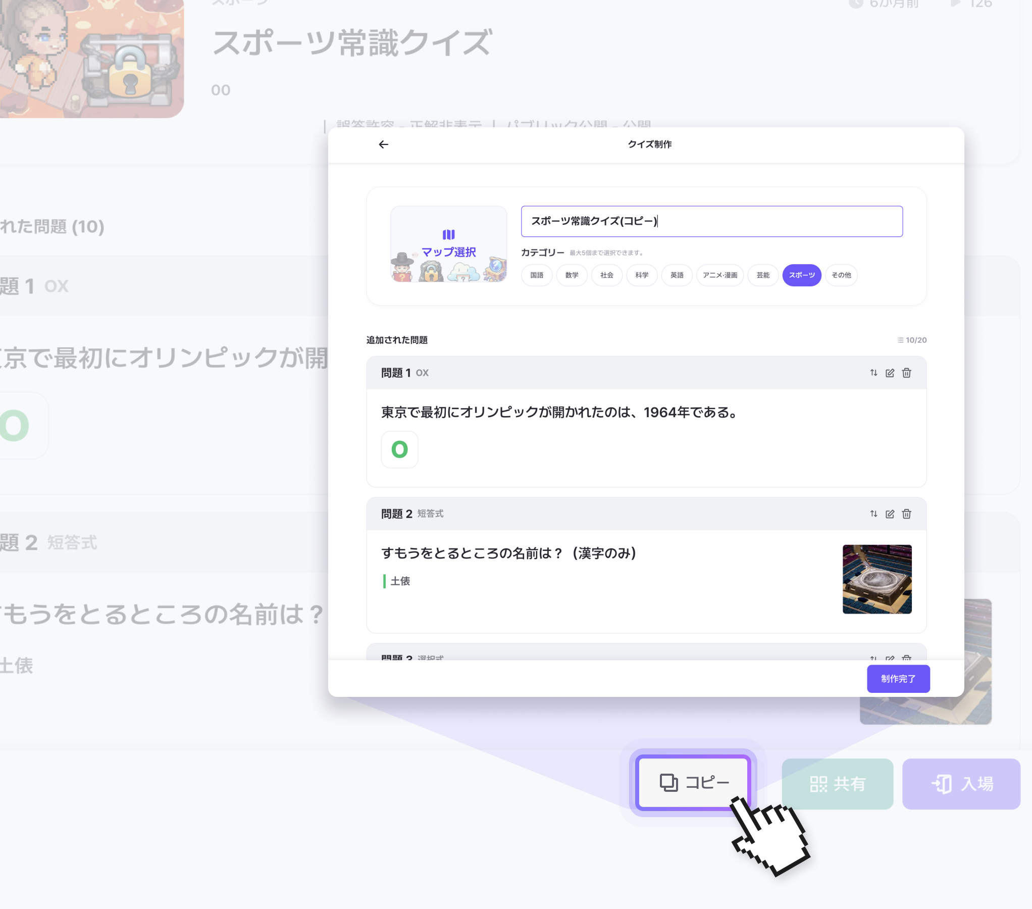 コピーボタンをクリックします。コピーされたクイズで無料提供されるマップを一つを選び、新しいクイズとして保存してください。