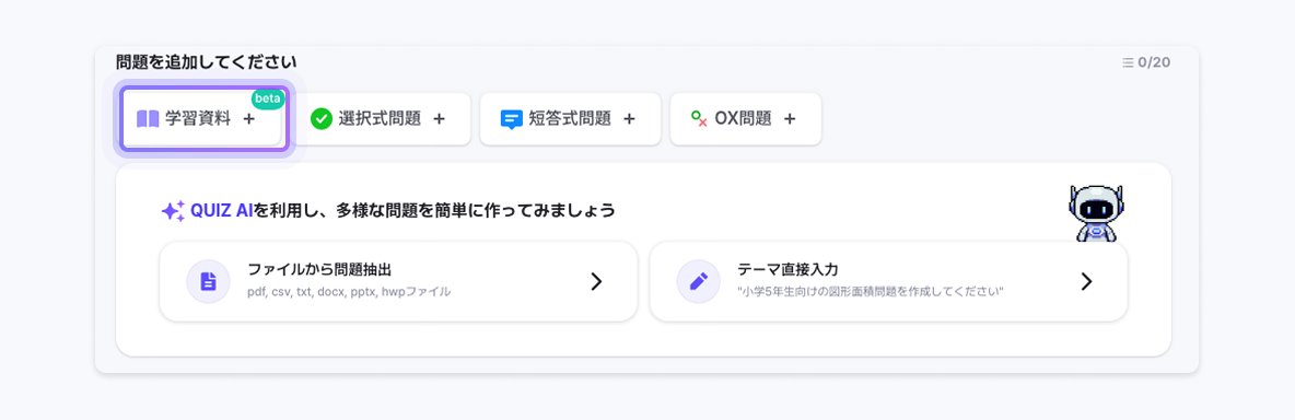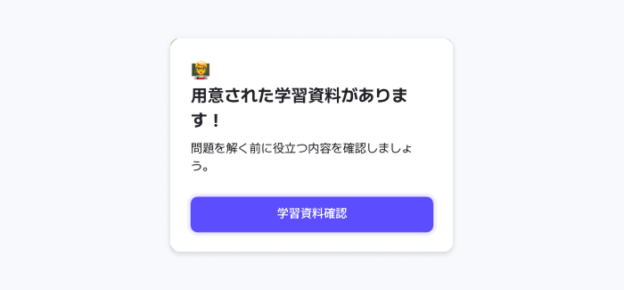 これからクイズ問題を解く前に、教材や学習プリントを追加し、学習後クイズを解くことができます。