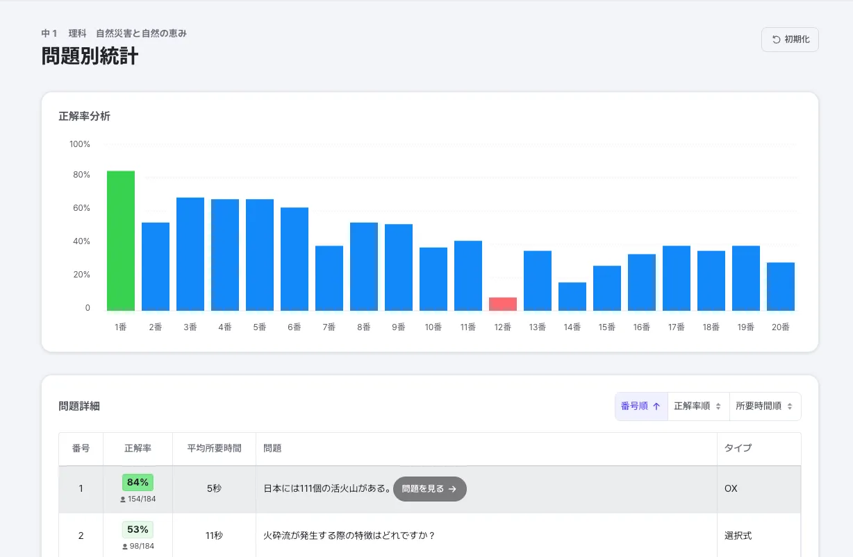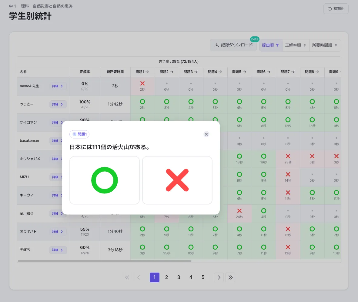 また、学生別統計画面で問題番号横の矢印アイコンをクリックすると、同じ問題のモーダルが表示され、クイズの分析がさらに簡単になりました!