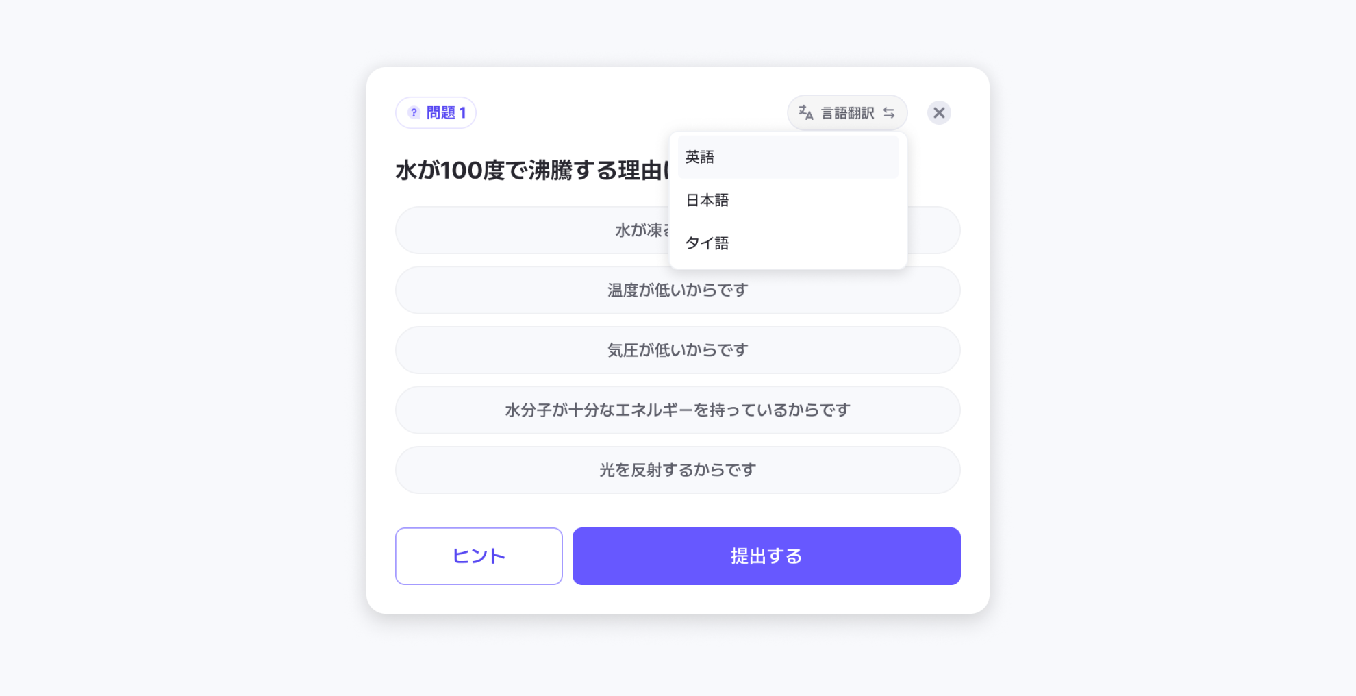 選択した言語に応じて、AIが問題文を自動で翻訳し、そのまま表示されます。