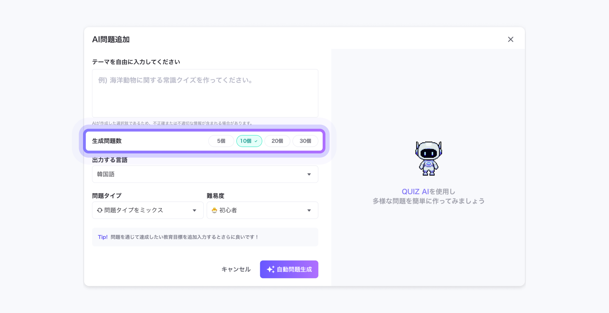 AIで問題を作成する際に、出題数を自由に選べるようになりました。