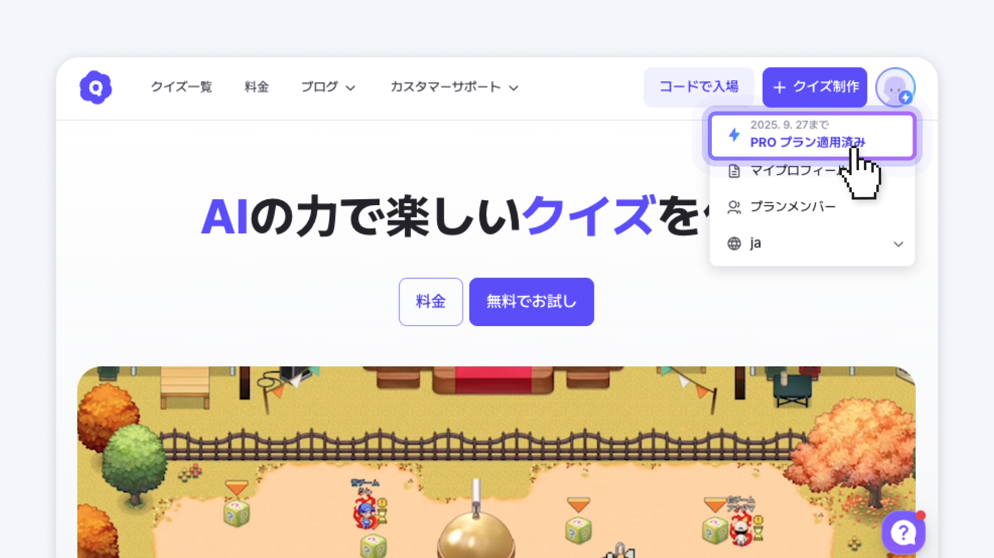 プランが有効になると、画面右上の プロフィールメニュー からプランの種類と期間を確認できます。